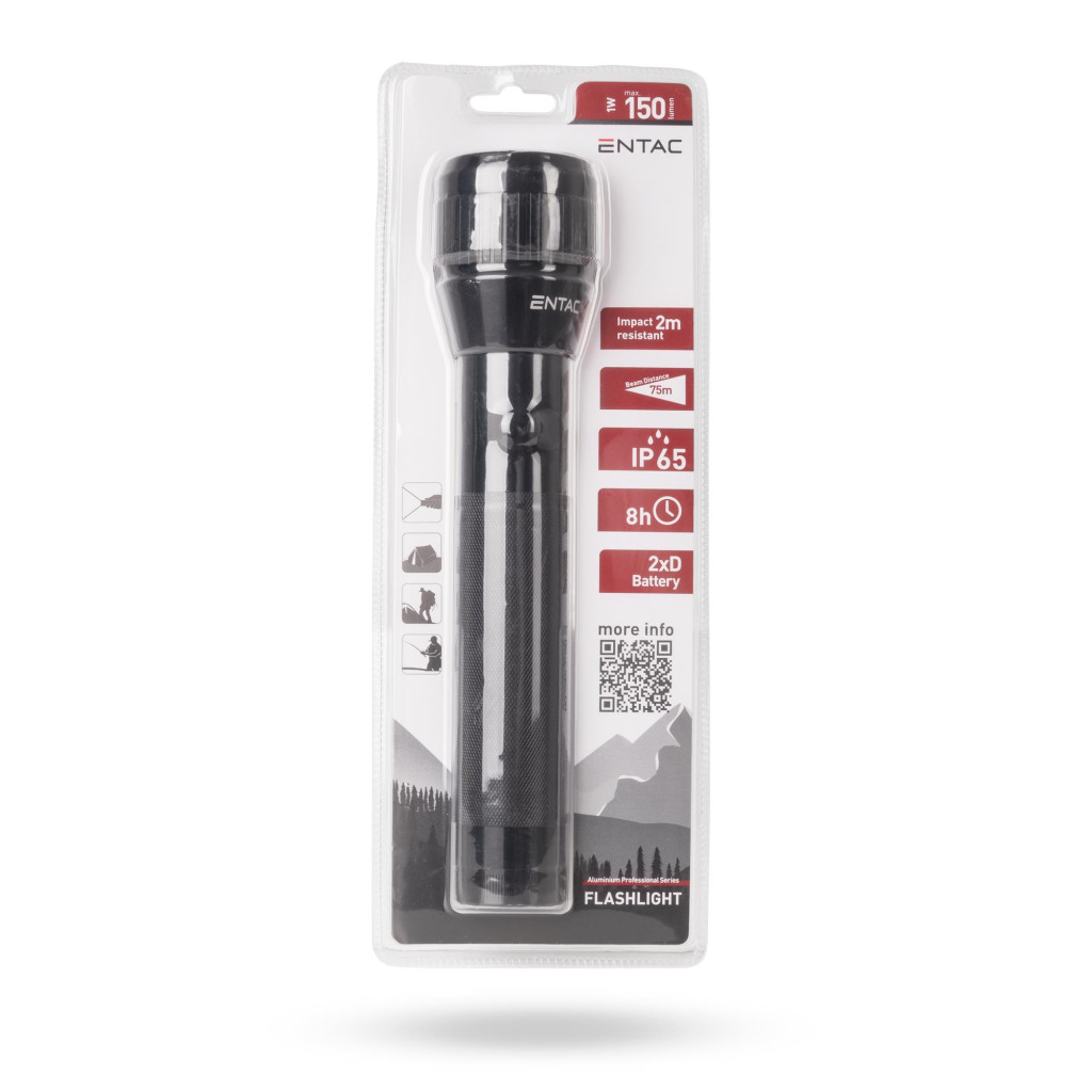 Entac: A megfizethető minőség!_LEIRAS_Két darab, bárhol kapható D elemmel üzemeltethető, tartós aluminiumból készült lámpatestű kézilámpa 150Lumen fényteljesítménnyel.