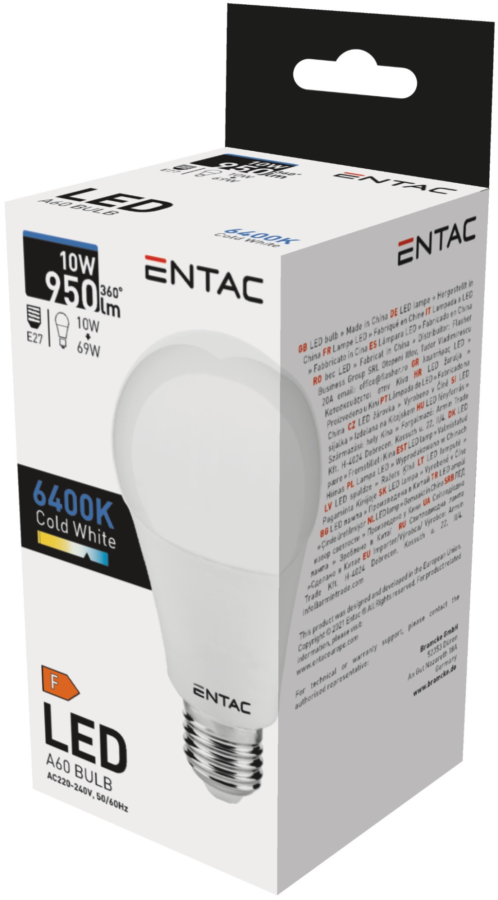 Entac LED Globe E27 10W CW 6400K10 W teljesítmény, 950 lm fényáram, IP20 védelem.