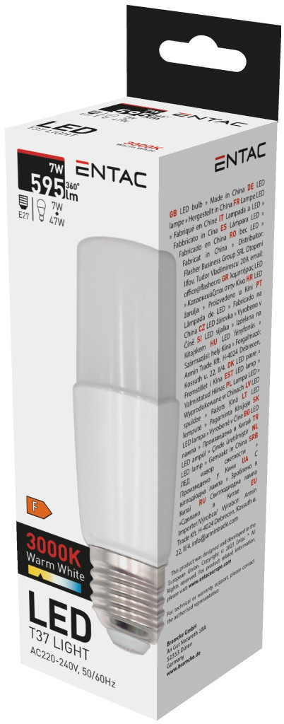 Entac LED T37 E27 7W WW 3000K7 W teljesítmény, 595 lm fényáram.