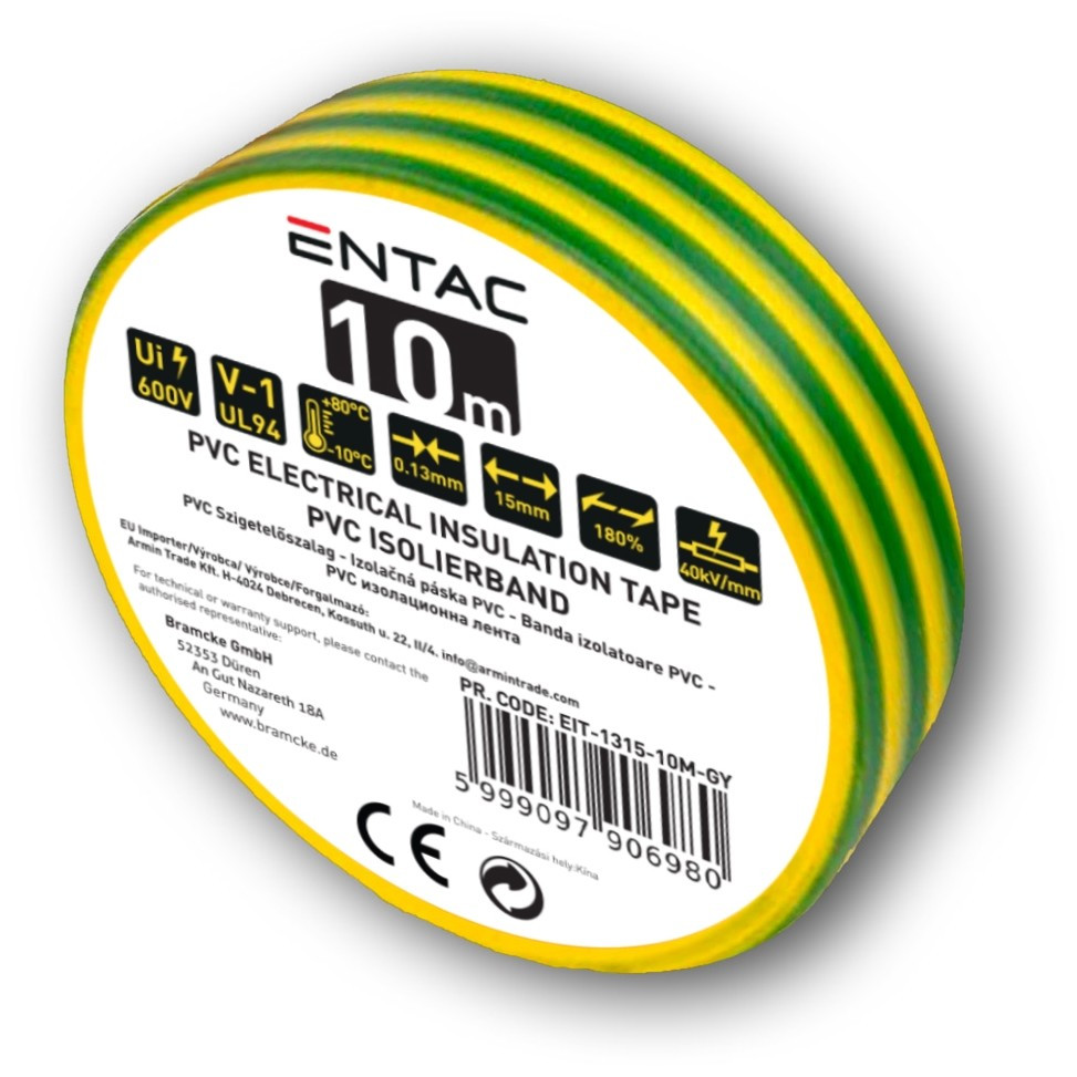 Entac Szigetelőszalag 0.13x15mm Zöld-Sárga 10m (EIT-1315-10M-GY)
